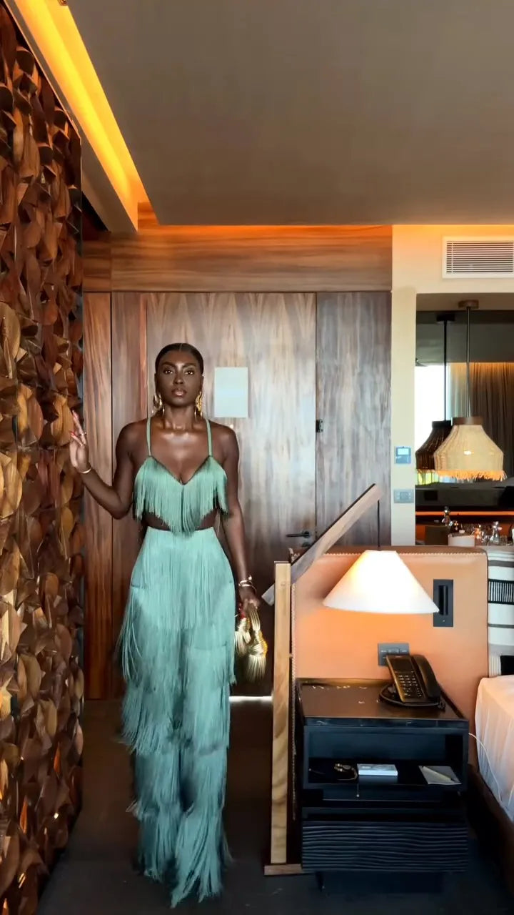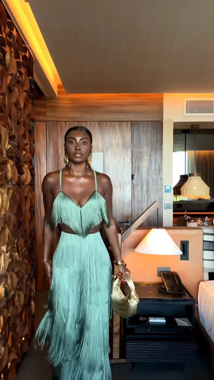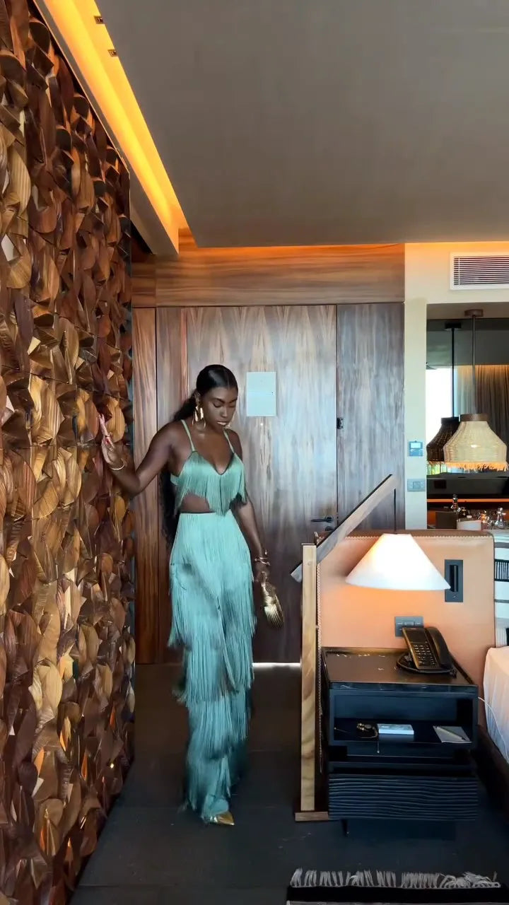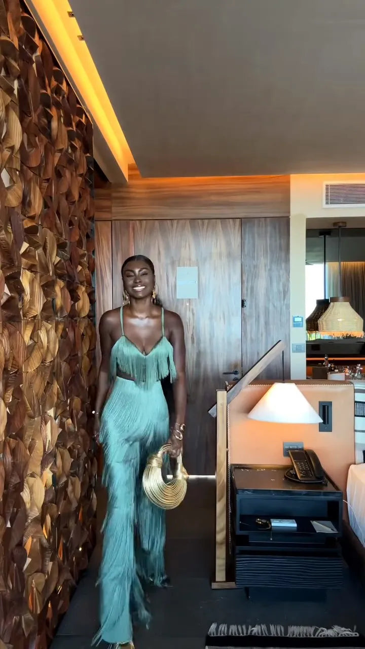 CONJUNTO 2 PEÇAS TODO EM FRANJAS TOP + CALÇA VERDE. Confeccionado em Algodão e Poliéster. Top com decote V, alças finas e fechamento por zíper invisível. Calça estilo flare, com caimento leve e fluído e forro interno. O conjunto é todo confeccionado em franjas soltinhas na cor verde. Disponível nos tamanhos P, M, G e GG.