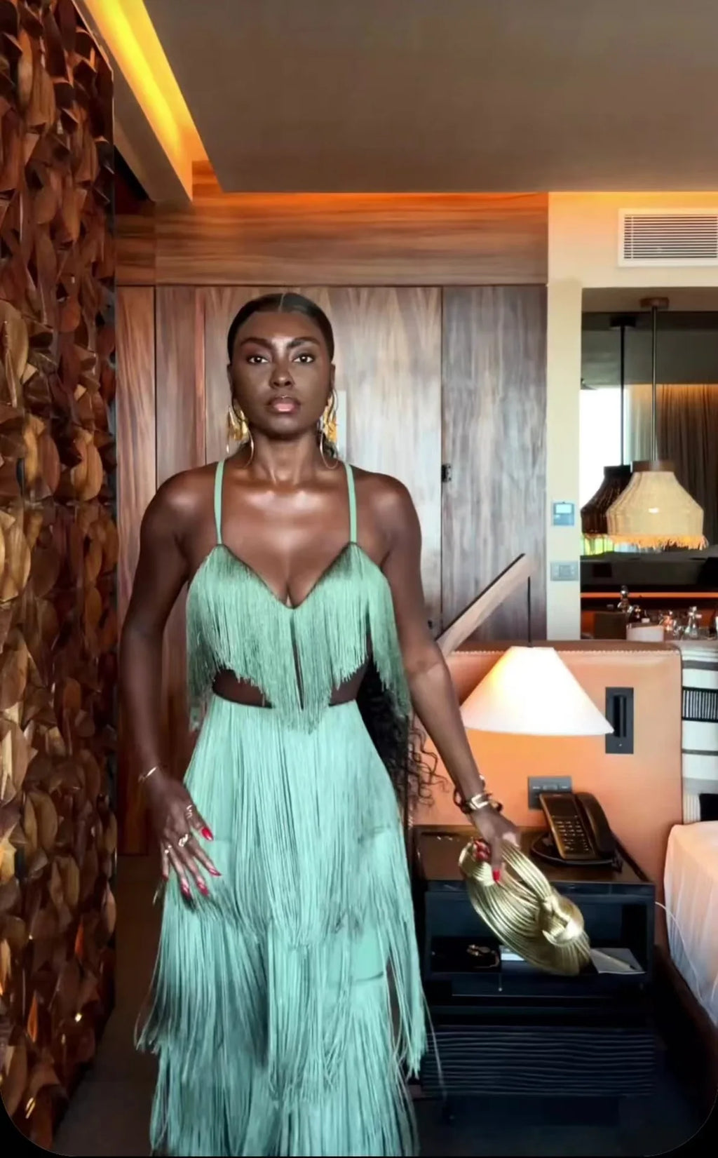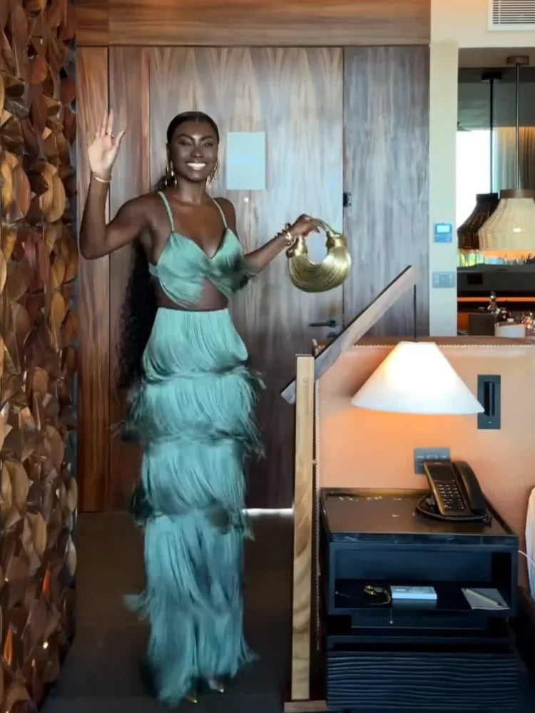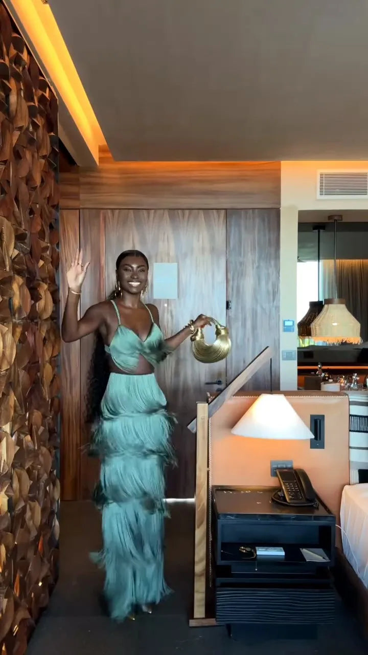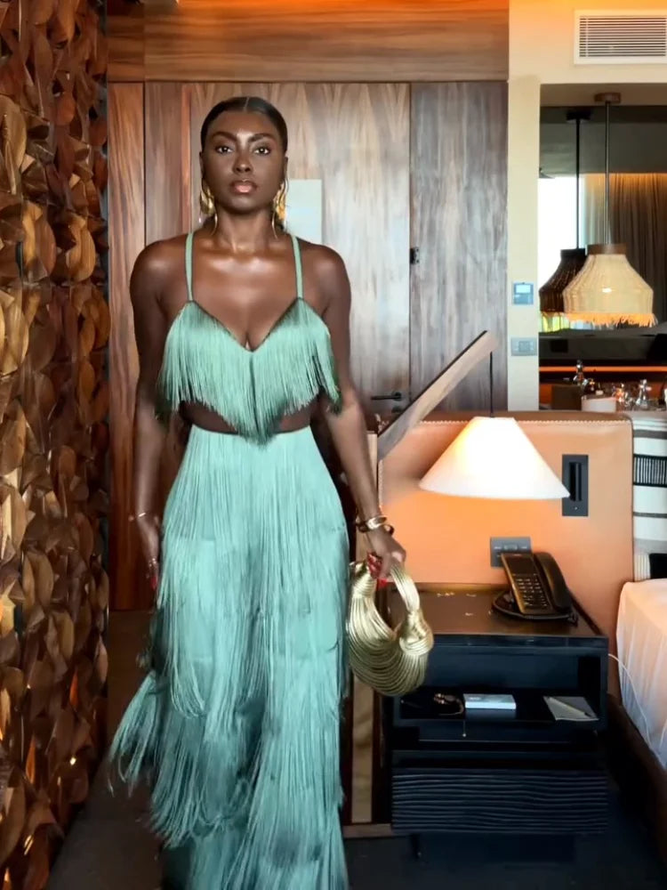 CONJUNTO 2 PEÇAS TODO EM FRANJAS TOP + CALÇA VERDE. Confeccionado em Algodão e Poliéster. Top com decote V, alças finas e fechamento por zíper invisível. Calça estilo flare, com caimento leve e fluído e forro interno. O conjunto é todo confeccionado em franjas soltinhas na cor verde. Disponível nos tamanhos P, M, G e GG.