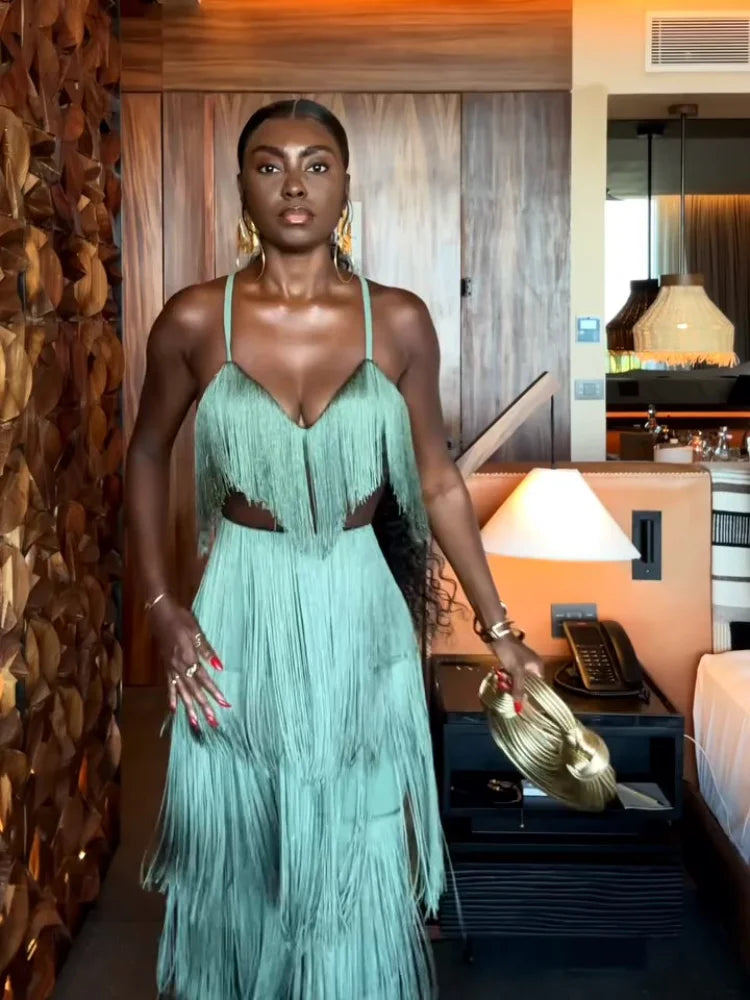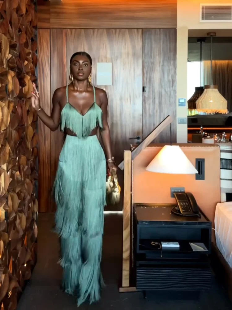 CONJUNTO 2 PEÇAS TODO EM FRANJAS TOP + CALÇA VERDE