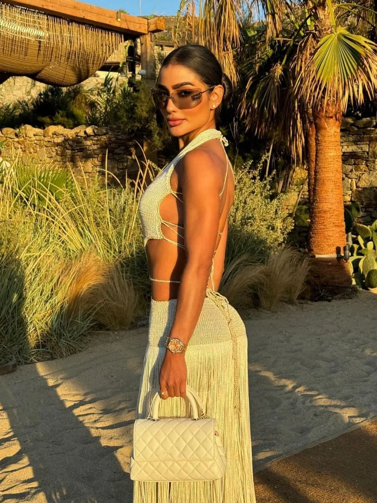 VESTIDO LONGO DE FRANJAS COM RECORTES ASSIMÉTRICOS OFF WHITE. Confeccionado em Algodão, Poliéster e Elastano. Possui comprimento longo, com caimento leve e fluído todo em Franjas, recortes assimétricos no abdômen, decote V profundo, com amarração no pescoço e costas, sem bojo e forro interno na saia. É o look perfeito para ir à praia! Disponível nos tamanhos PP, P, M, G e GG.